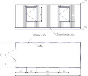 Бытовки с размерами 3, 4, 5 или 6 метров длиной, шириной 2,4 метра, высотой 2,4 метра.