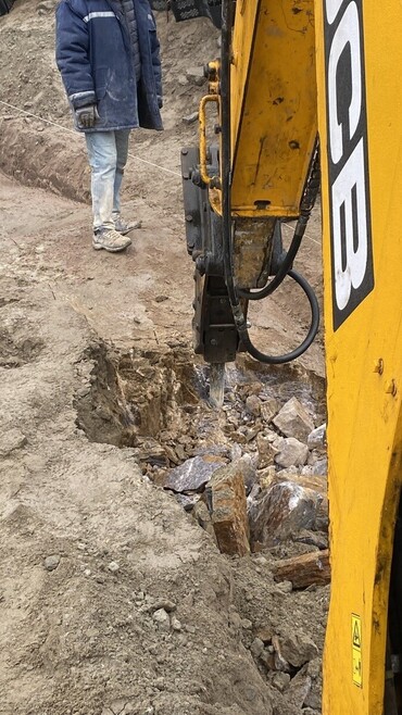 Гидромолот JCB HM380 при максимальной частоте и силе удара издает минимальное количество шума. Он устанавливается на место снятого ковша или рукояти. Позволяет снизить затраты времени и денег на производство земляных работ, где необходимо привлечение 3-4 человек справится один с гидромолотом.